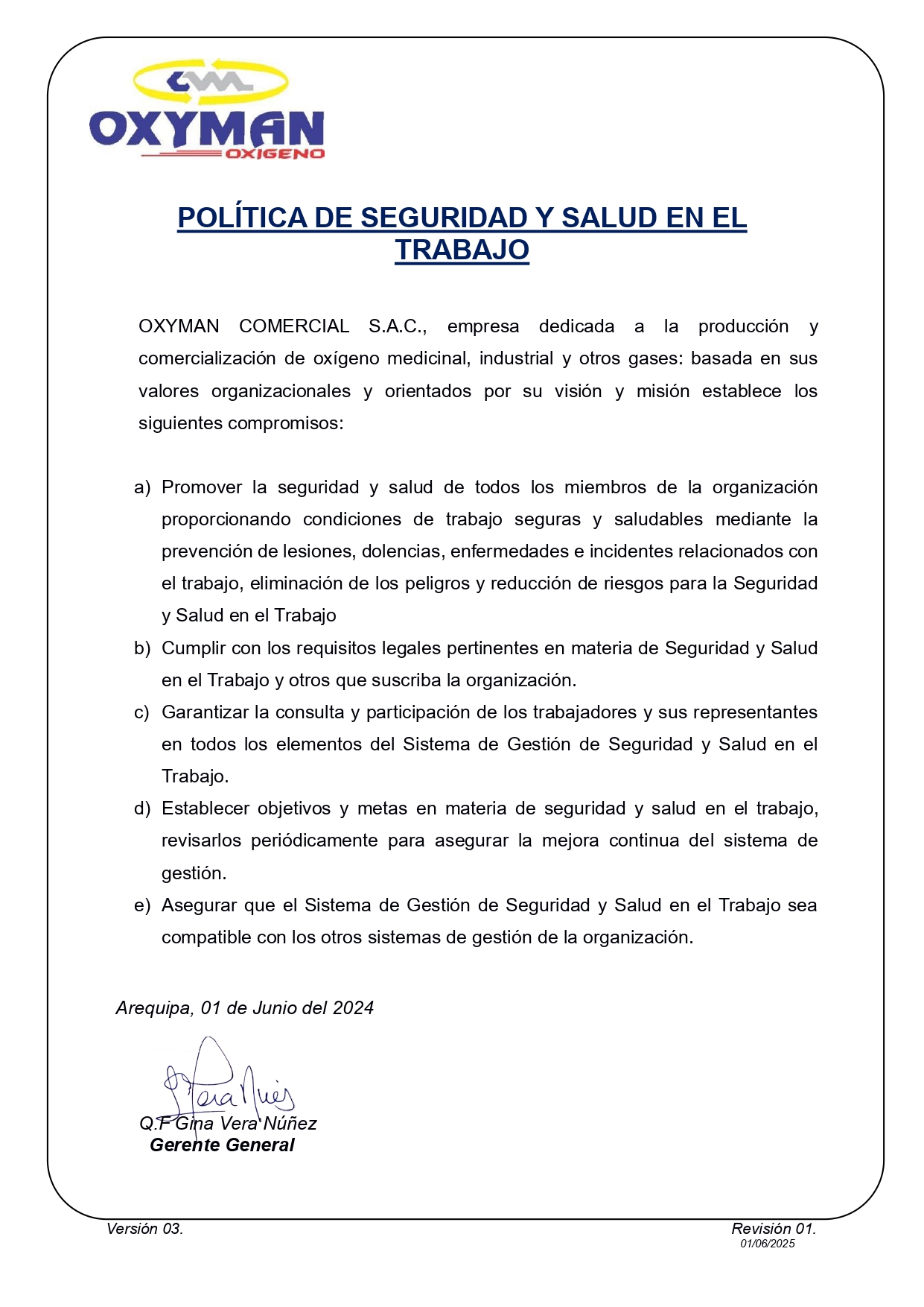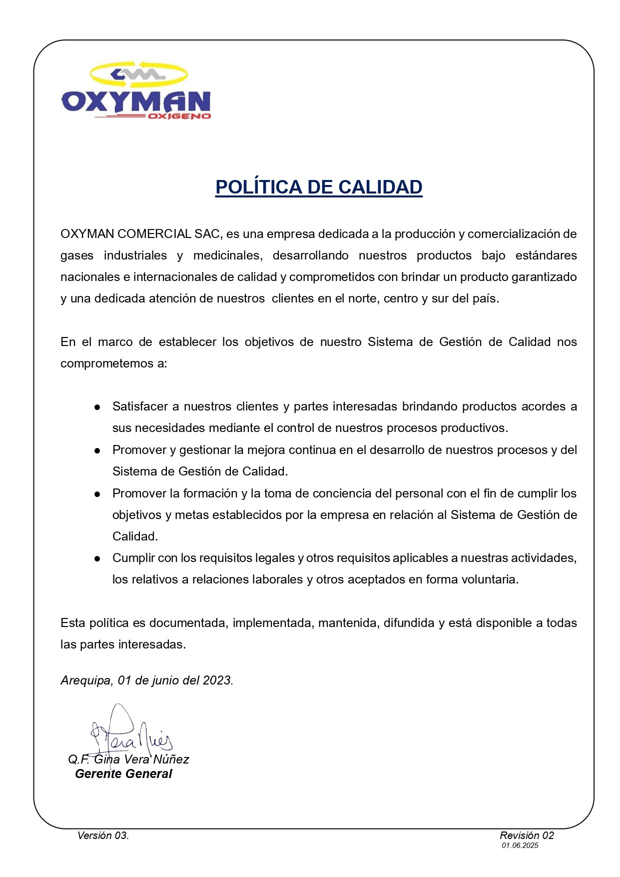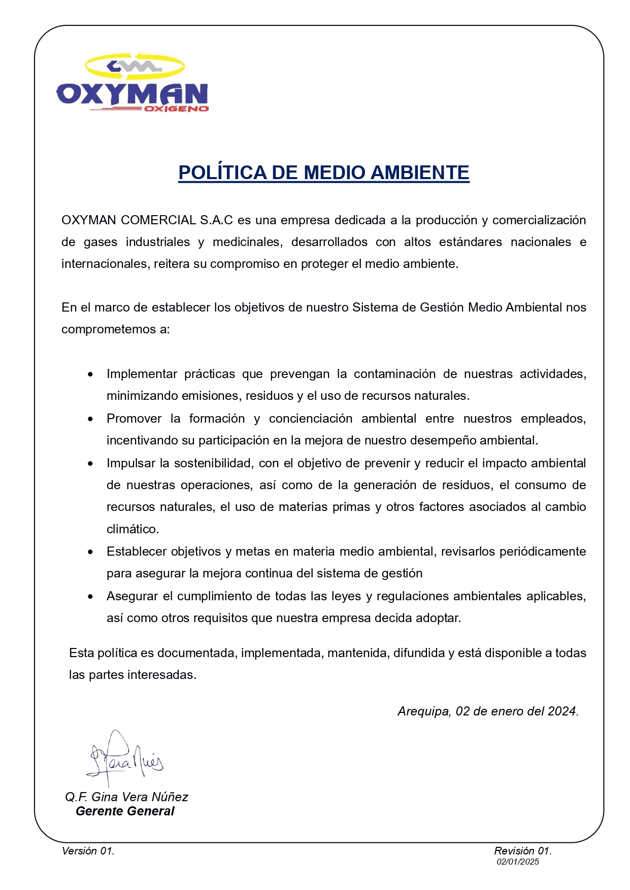 OXYMAN es una empresa que cuenta con tecnología criogénica, comprometida con proporcionar gases industriales y medicinales de acuerdo a las necesidades de sus clientes, cumpliendo los requisitos legales, los de la organización y buscando la mejora continua de sus procesos.